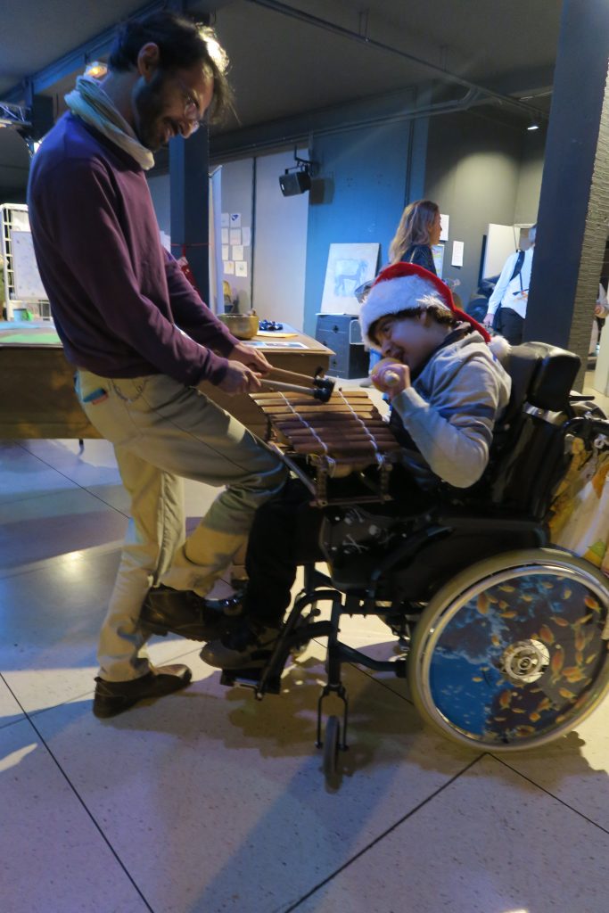 Mention spéciale à notre musicothérapeute : Monsieur Eric Lechâble dont les compétences ont permis d’offrir des séances de musicothérapie aux enfants polyhandicapés. Cet atelier a consisté en la découverte de sons, de tonalités variées et de divers styles musicaux. La pluralité instrumentale a contribué à la découverte de stimuli sonores inexpérimentés et au développement cognitif de chaque enfant via les rythmes. Notamment pour les enfants polyhandicapés dont la cognition recèle d’autres modalités à explorer pour optimiser leur capital santé. En effet, chaque stimulus induit une réaction de l’enfant, compte tenu de la profondeur de leur for intérieur.